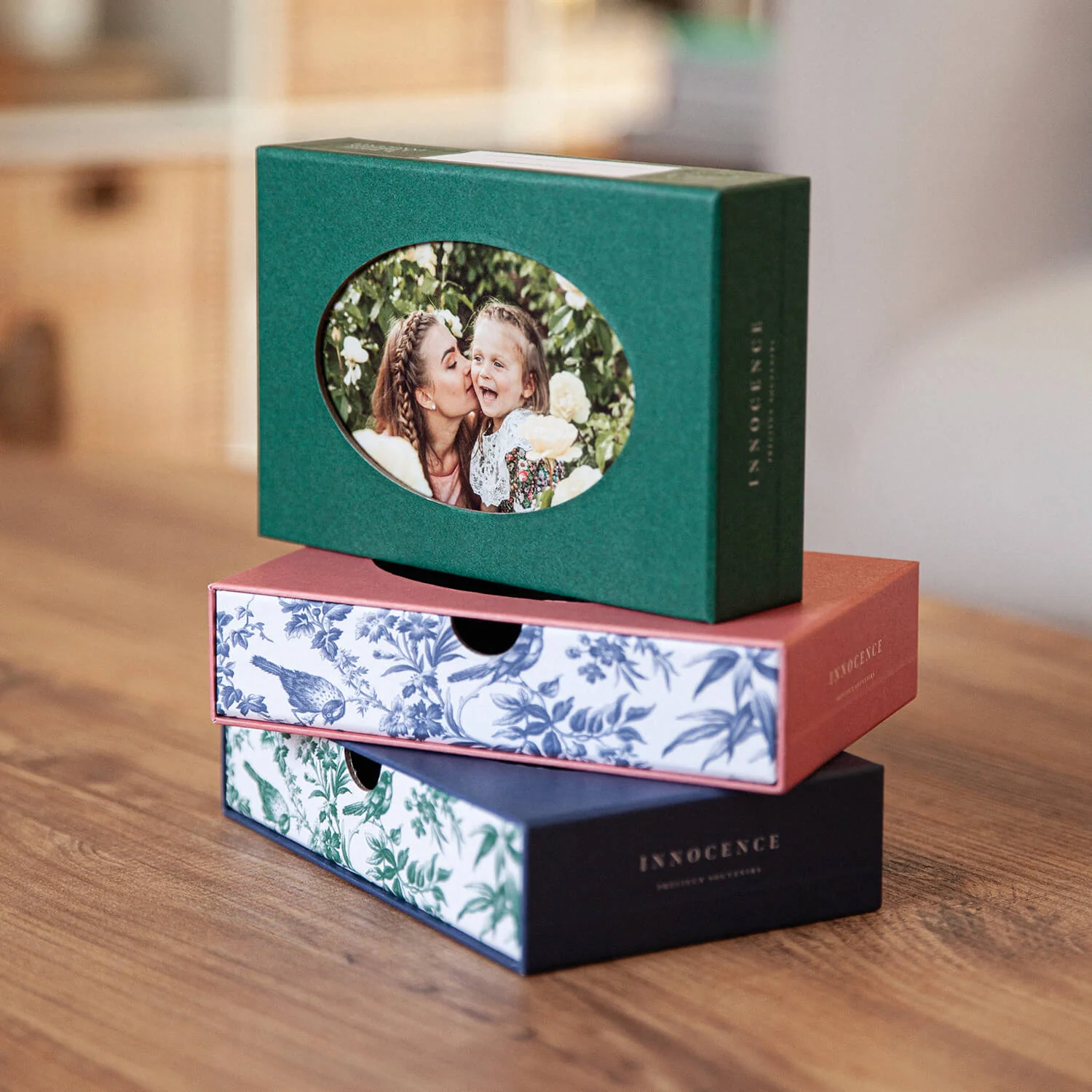 Son design unique, pensé comme une boîte tiroir, dévoile une ouverture ovale qui laisse apparaître la première photo : un détail simple, mais plein d’émotion. Posée, elle pourra même servir de cadre !